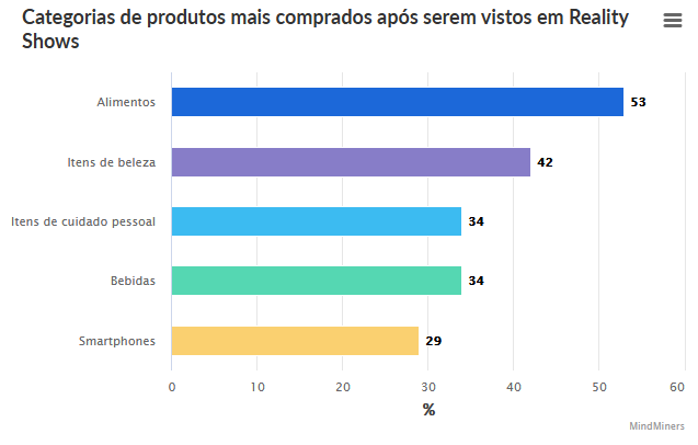 À pesquisa da MindMiners, 42% dos consumidores brasileiros revelaram que já conheceram alguma marca ou produto por meio de um reality show. Mais ainda, 32% declararam que o interesse por determinado produto aumentou após ele ser visto no programa.