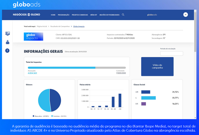 Os anunciantes ou suas agências também podem acompanhar a exibição dos anúncios pelo Globo Impacto no painel do Globo Ads. Ali é possível ver quantos impactos foram alcançados em determinado momento, além de algumas informações a respeito do público impactado.
