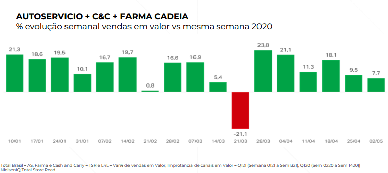 No entanto, observando o valor das vendas em 2021, na comparação com o mesmo período de 2020, percebemos um crescimento do varejo brasileiro. O percentual da evolução semanal das vendas em valor tem se mantido positivo na maior parte deste ano.