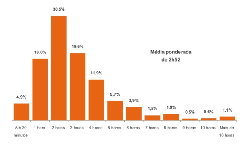 A PodPesquisa 2019 ainda mostra que os brasileiros passam em média 2 horas e 52 minutos ouvindo podcasts por dia, tempo esse dividido na maioria dos casos entre a assinatura de um a cinco programas.