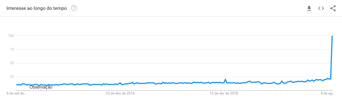 Evolução da busca por “podcast” no Brasil, entre 2015 e 2019. O salto ocorreu após a exibição no Jornal Nacional, em 26/08/19. (Fonte)