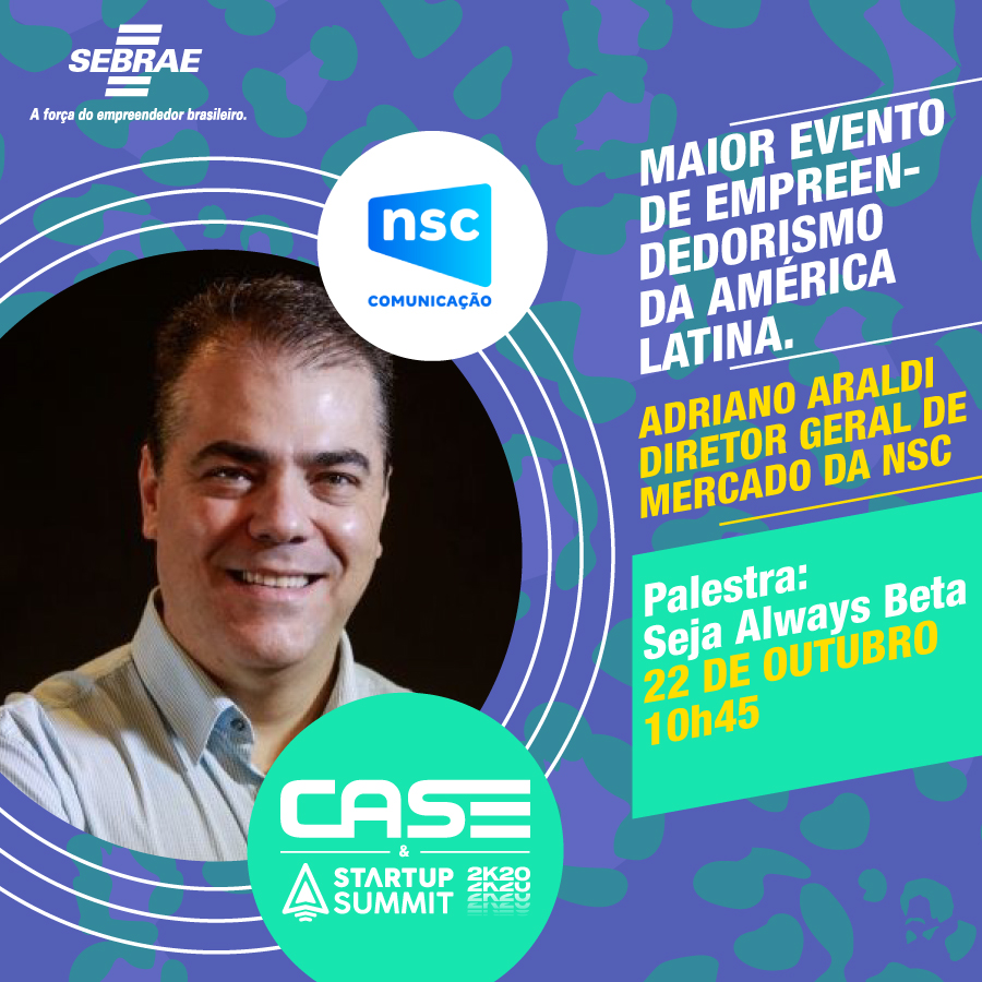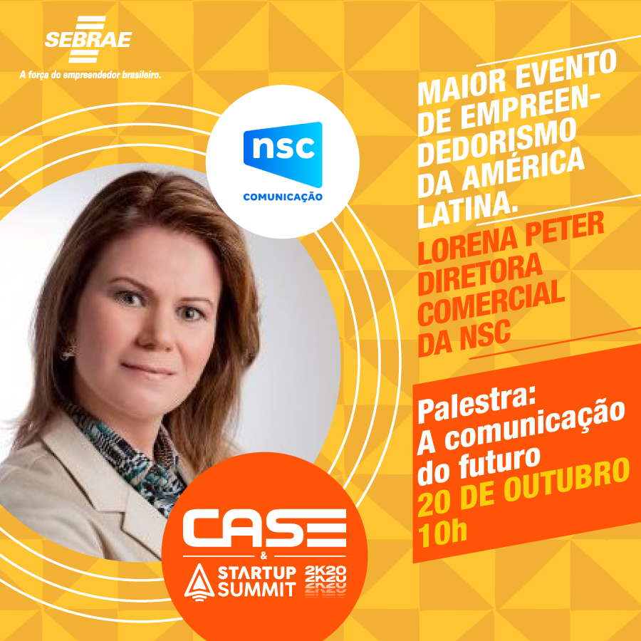 A NSC e o Negócios SC apoiam o CASE & Startup Summit 2K20 e representam no evento a transformação da comunicação e mídia. Lorena Peter, diretora comercial da NSC, estará ao vivo às 10h do dia 20 falando sobre “Reinvente-se: A comunicação do futuro”. Já Adriano Araldi, diretor geral de mercado, aparecerá às 10h45 do dia 22 com a palestra “Seja Always Beta”.