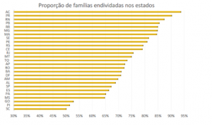 Nível de endividamento das famílias por estado no Brasil. (Fonte: Peic, CNC)